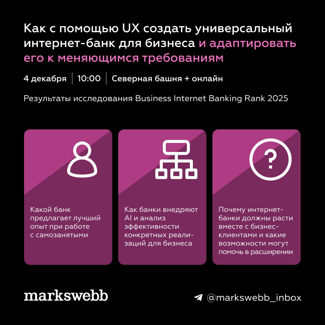 Markswebb Channel pinned «4 декабря расскажем, какой пользовательский опыт должен быть в продуктах интернет-банка, чтобы отвечать актуальным запросам бизнес-клиентов. Приглашаем всех, кто развивает интернет-банк, посетить митап по результатам исследования Business Internet Banking…»