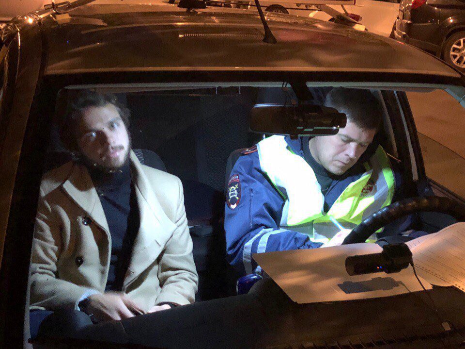 Футболист Георгий Тигиев звонит кому-то из машины ДПС, пока на него составляют протокол. А оператору обещает разбить телефон (а мог бы и голову).