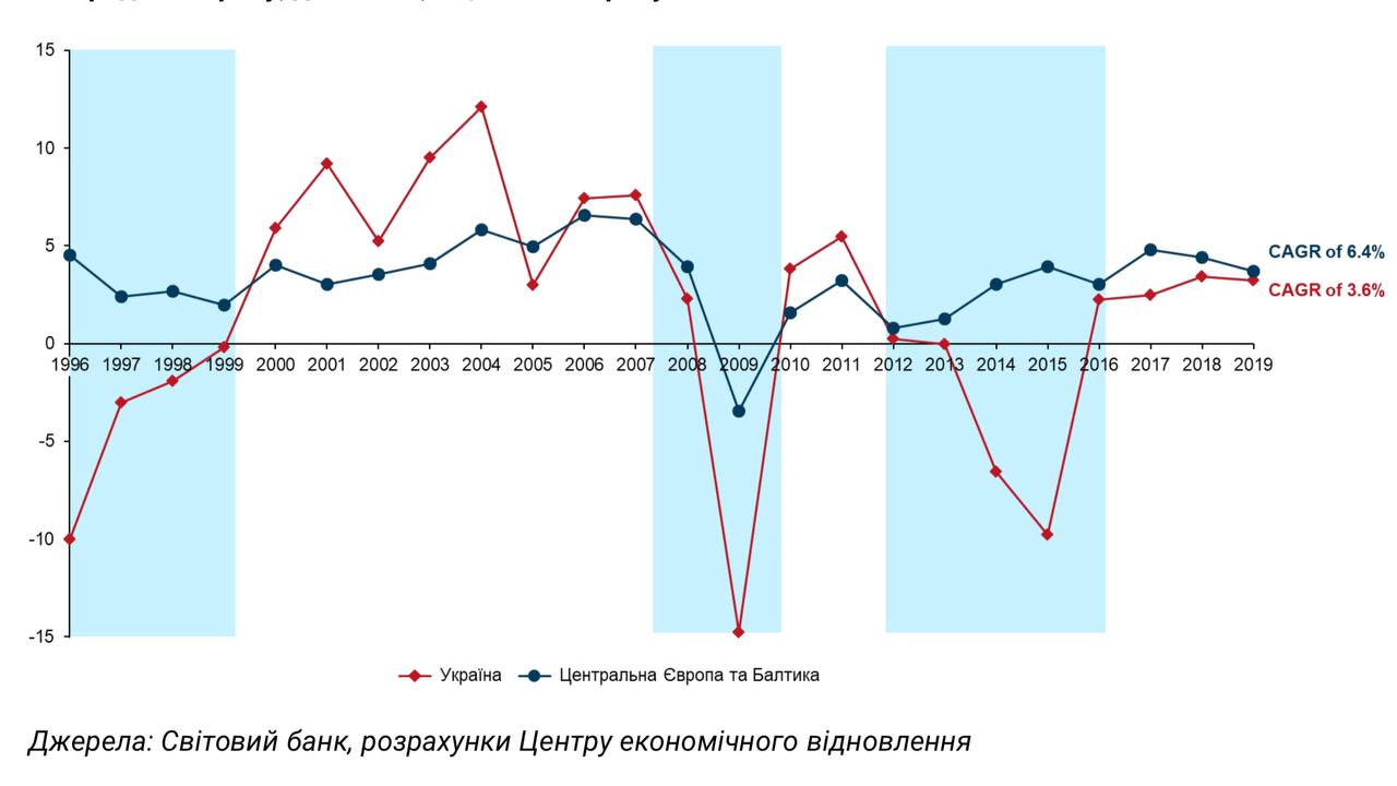 Під час Глобальної рецесії 2008–2009 років реальний ВВП України провалився аж на 15%, після чого так і не зміг повернутись до докризових значень.