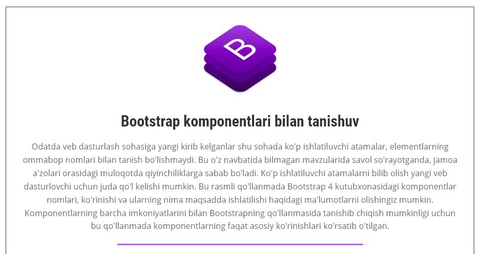 Assalomu alaykum. Salomatmisizlar? Birmuncha vaqt oldin Bootstrap 4 kutubxonasidagi komponentlar haqida kichik qo'llanmani chiqargan edik. O'sha qo'llanmaga oz-moz yangi ma'lumot kiritildi. Hozirgi holatida Bootstrapdagi 15 ta komponent haqida ma'lumot olishingiz mumkin. Bir ko'rib baho bering βΊοΈ