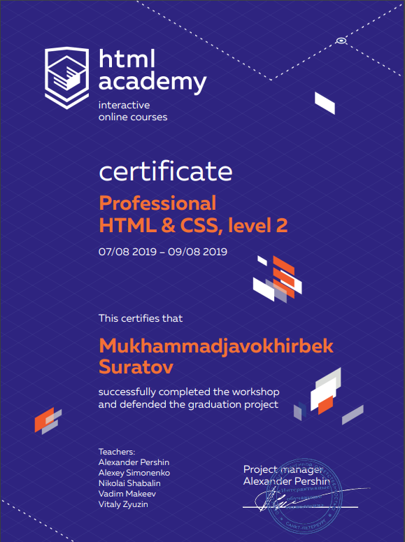 HTMLAcademyning 2-bosqich HTML va CSS kursini muvaffaqiyatli tugatdim 🎊🎉 "Мишка" nomli loyihani turli ekranlarga moslashuvchan ko'rinishda tuzib chiqdim. Afsuski, bu safar vaqt yetmaganligi sabab ko'p ham mashq qila olmadim. Lekin bu kursda berilgan bilimlar, Xudo xohlasa, ko'p xizmat qiladi, degan umiddaman. Mana bu ikkinchi kurs tugatilgani haqida sertifikat. Nasib qilsa, pochtadan ham yuborishadi. Oldingi safar kimdir bechora sertifikatni ikkiga buklagan ekan, qiyshayib qolibdi :(
