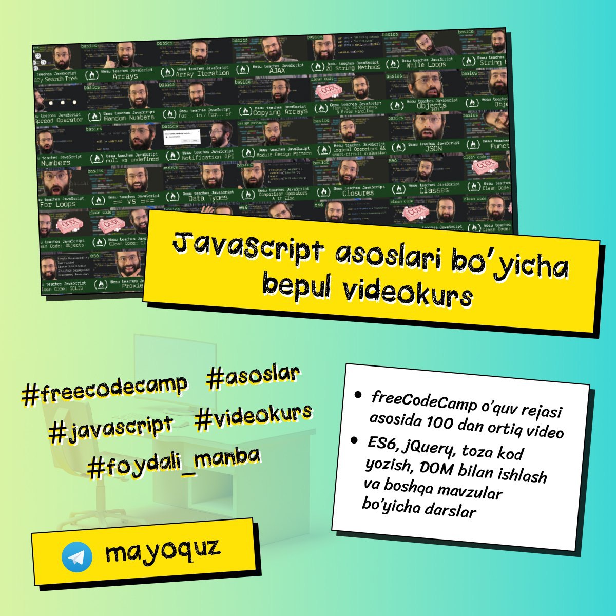 Havola: https://www.freecodecamp.org/news/my-giant-javascript-basics-course-is-now-live-on-youtube-and-its-100-free-9020a21bbc27/
