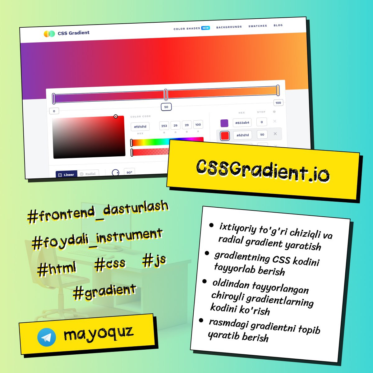 O'z saytingiz uchun biron chiroyli gradient rang yaratmoqchi bo'lsangiz, CSSGradient.io sizga qo'l keladi. Uning imkoniyatlari: