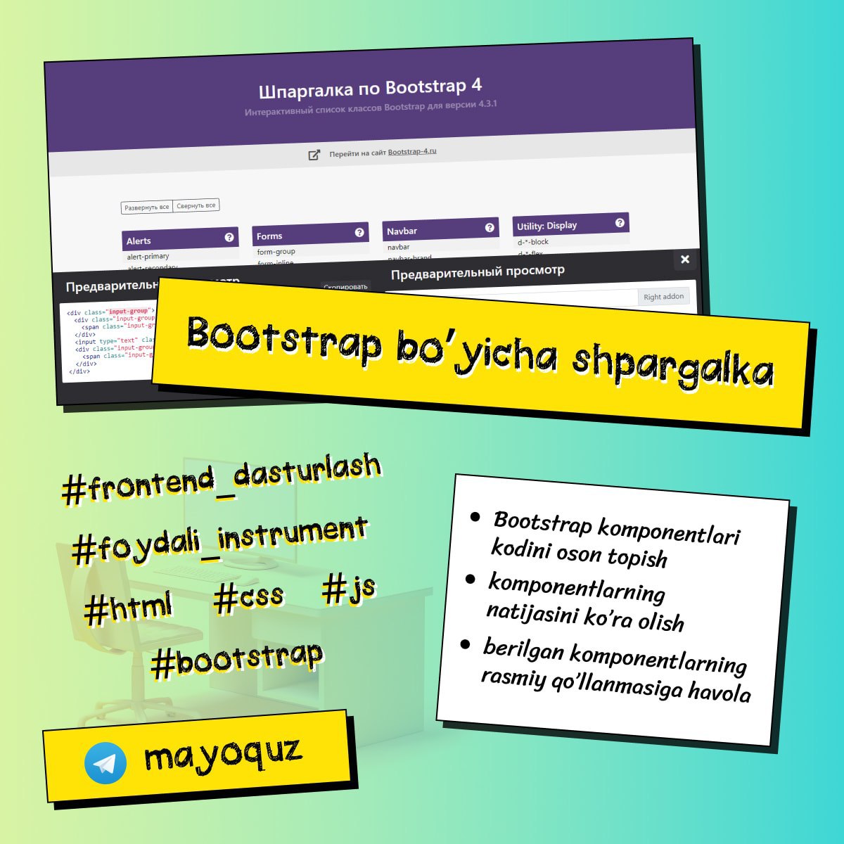 Bootstrapni endi o'rganayotganlar undagi komponentlar kodini topishda qiynalishadi. Shu ishni osonlashtirish uchun Bootstrap shpargalkasi berilgan saytdan foydalanish mumkin.
