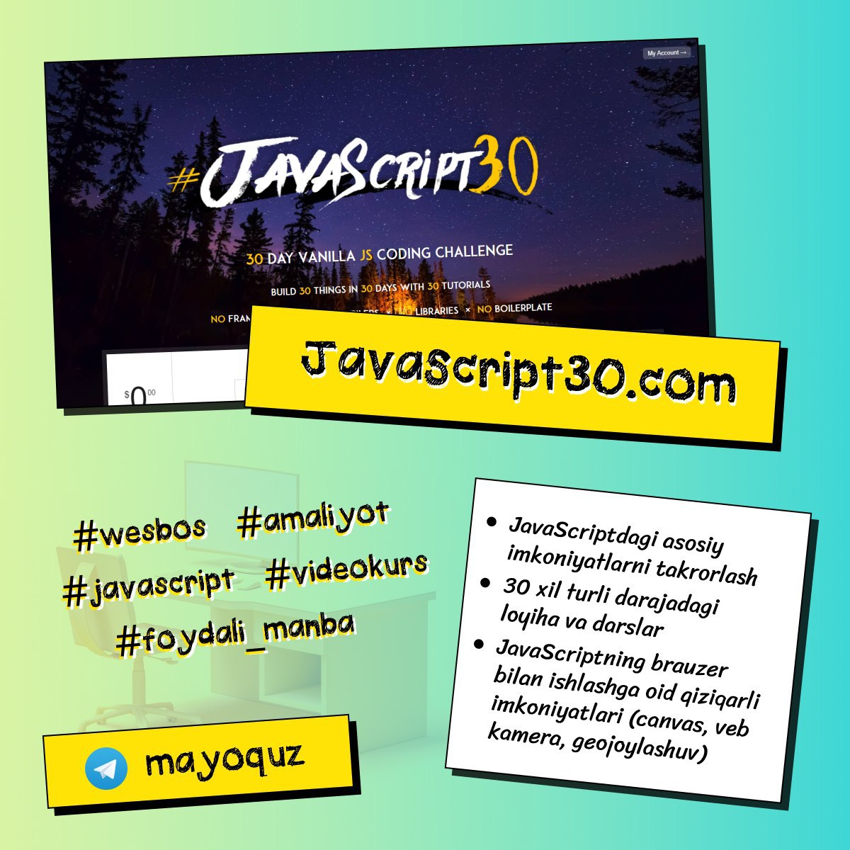📖 Foydali manba: JavaScript30 - JS haqida 30 ta qiziqarli va amaliy videodars