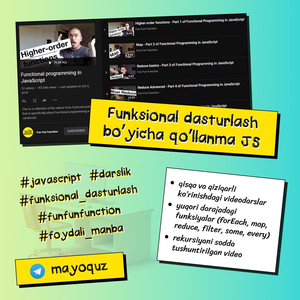 ⚒ Foydali manba: FunFunFunction kanalining JavaScriptdagi funksional dasturlash bo'yicha darslari