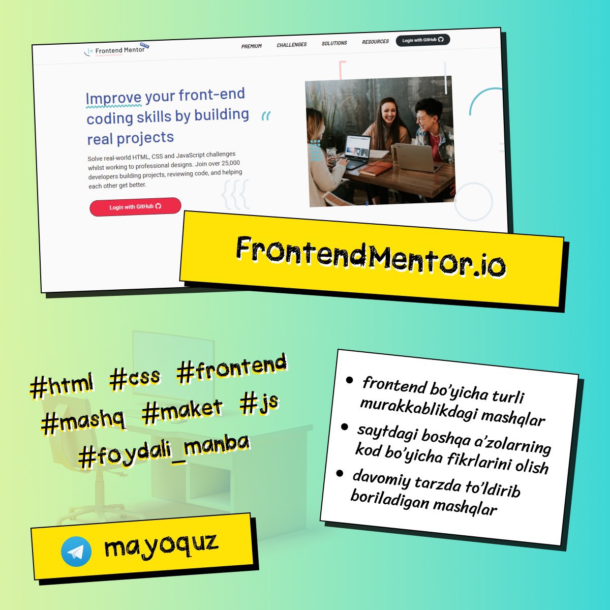 ⚒ Foydali manba: FrontendMentor.io - frontend bo'yicha mashq va vazifalar