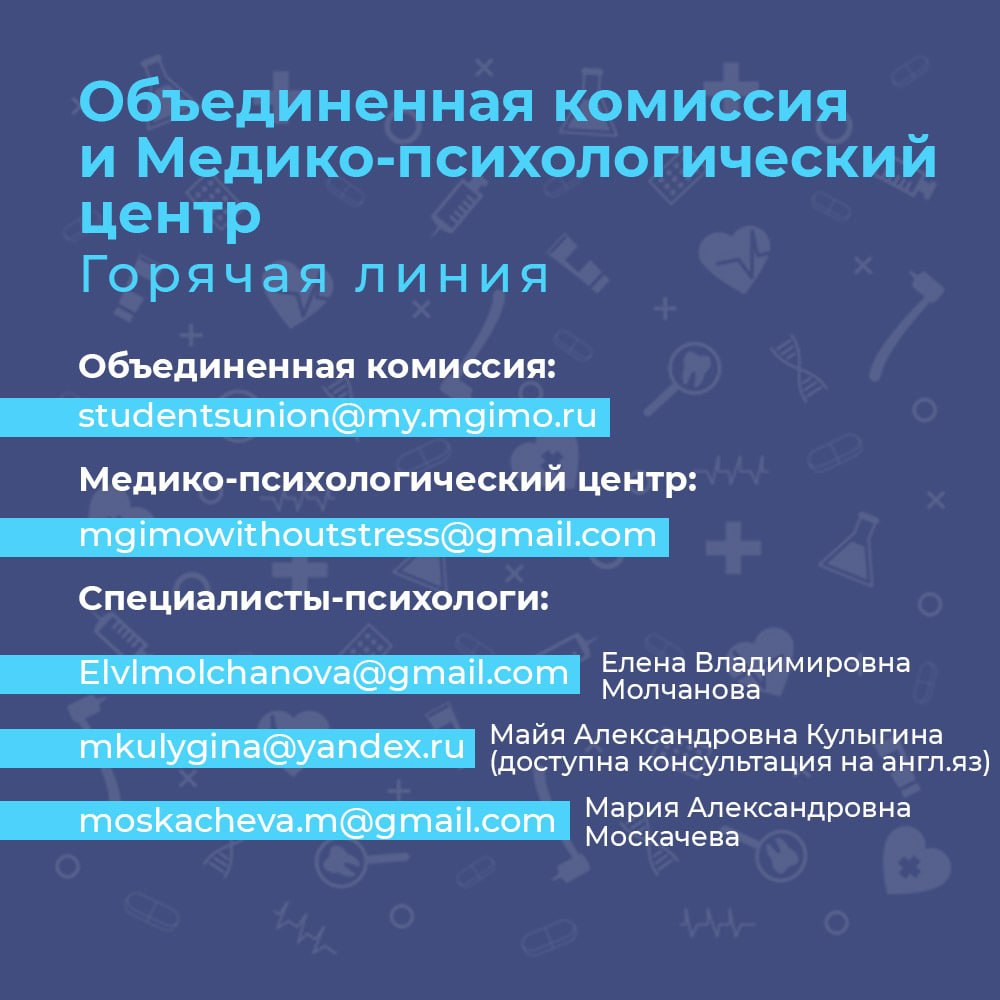 ❗️За психологической помощью можно обратиться к специалистам Медико-психологического центра. Обратиться в Центр можно по почте mgimowithoutstress@gmail.com, записаться на прием в кабинете №130 или обратиться напрямую к специалистам: