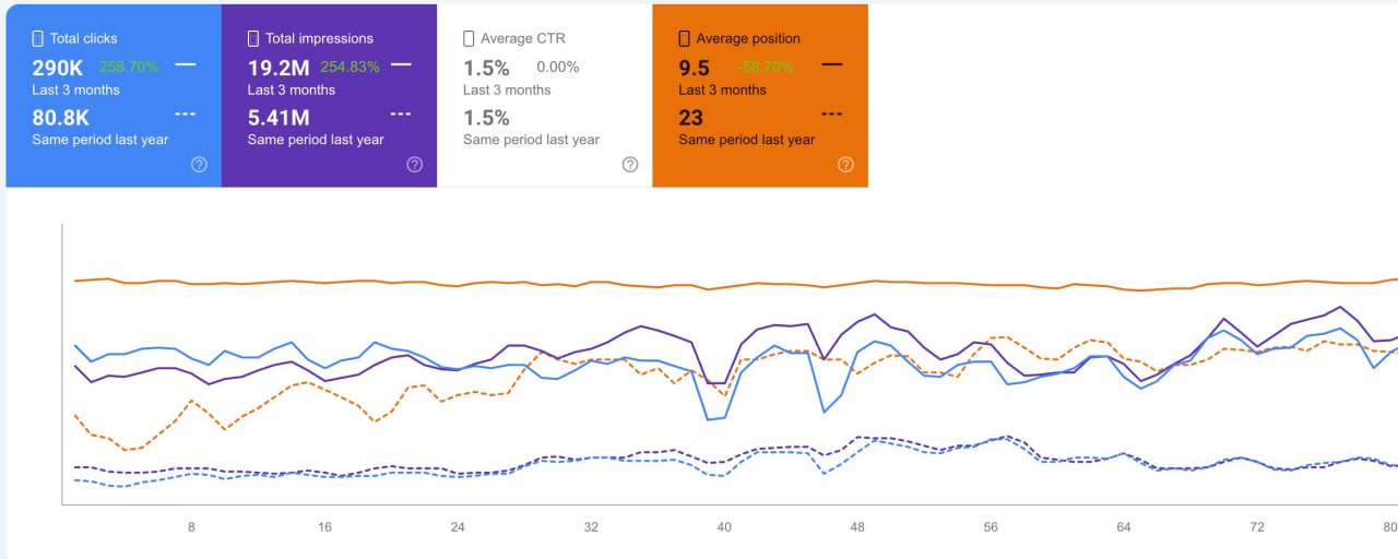 8K до 290K (+209.2K), а показы — с 5.41M до 19.2M (+13.79M).Средняя позиция улучшилась с 23 до 9.5 (+13.5 позиций), в то время как