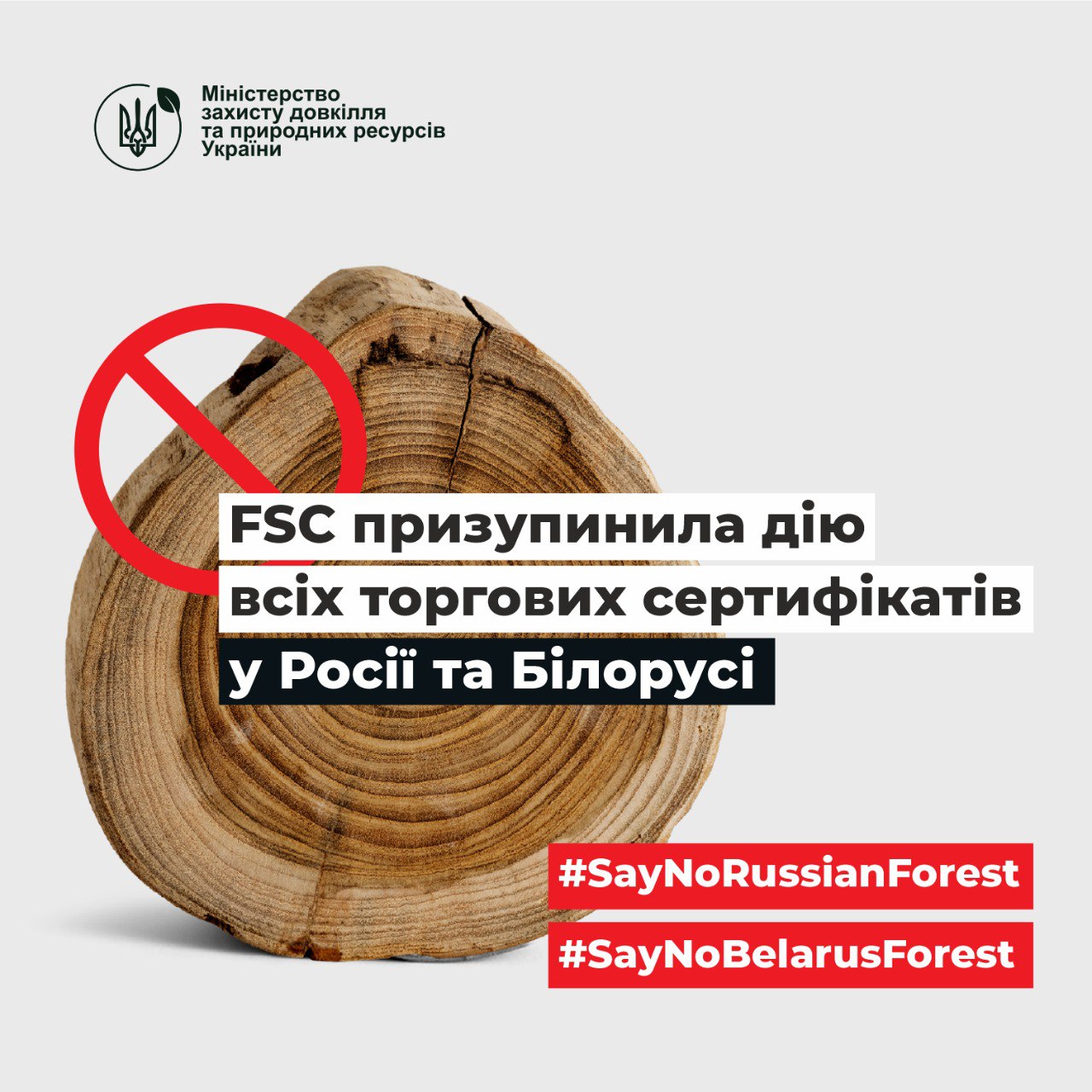 Міжнародна рада директорів Лісової опікунської ради FSC на звернення України погодилася призупинити дію всіх торгових сертифікатів у росії та білорусі та заблокувати всі контрольовані джерела деревини з цих країн.