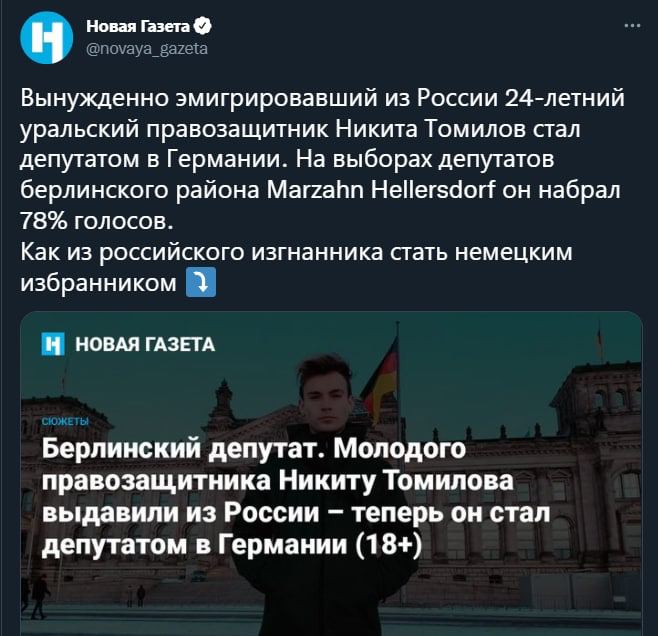 «Новая Газета» решила впечатлить своих читателей историей о беглом российском оппозиционере Никите Томилове, якобы ставшим большим политическим деятелем в Германии, избравшись на должность немецкого депутата. При этом журналисты как-то скромно умолчали о том, что россиянин занял там должность обыкновенного «общественника».