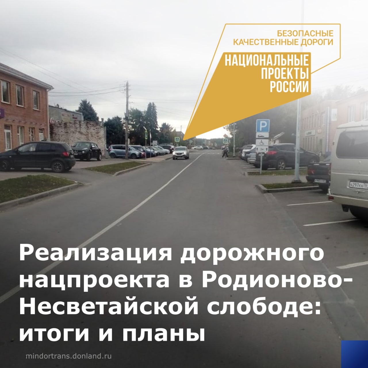 В слободе Родионово-Несветайская в 2021 году по национальному проекту «Безопасные качественные дороги» была выполнена реконструкция ул. Пушкинской. Подрядчиком проведены работы по устройству нового асфальтобетонного покрытия, уличного освещения, тротуара с тактильной плиткой и съездами для маломобильных групп населения, а также ливневой канализации.