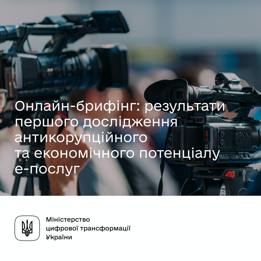У понеділок, 14 вересня, о 10:30 відбудеться онлайн-брифінг щодо презентації звіту «Антикорупційний та економічний потенціал е-послуг» — першої спроби комплексної оцінки економічного та антикорупційного ефекту від впровадження електронних державних послуг в Україні на прикладі 17 послуг.
