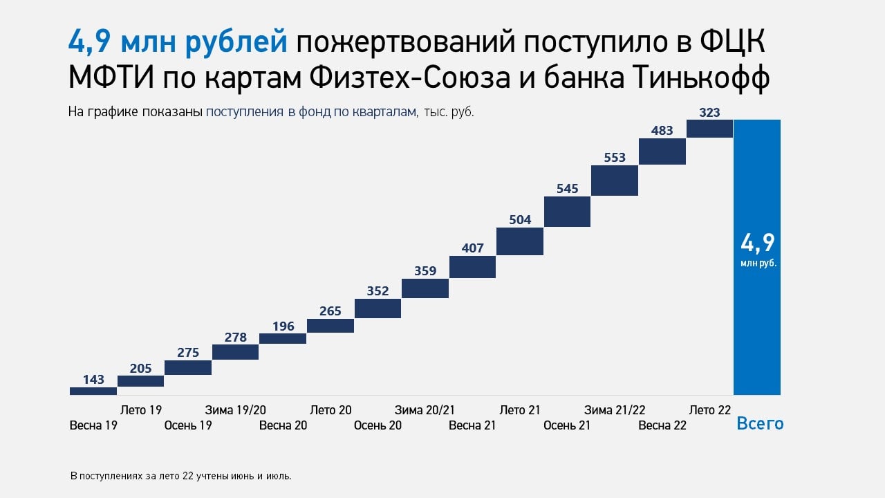 Самый простой способ поддержать развитие Физтеха - это оформить карту Физтех-Союза от банка Тинькофф. В этом случае 1% от суммы ваших покупок ежемесячно отправляется в Фонд целевого капитала МФТИ, чтобы поддерживать социально значимые проекты.