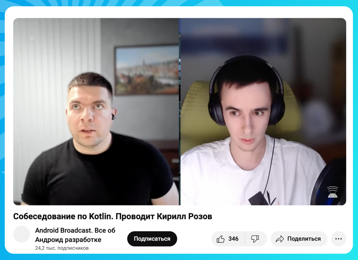 Это тестовое, но живое собеседование на знание языка Kotlin, которое включает теорию и кодинг.