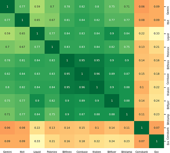 Как видим, наибольшая корреляция прослеживается между биржами #Bitfinex, #Coinbase, #Kraken, #Bitflyer и #Bitstamp❗️