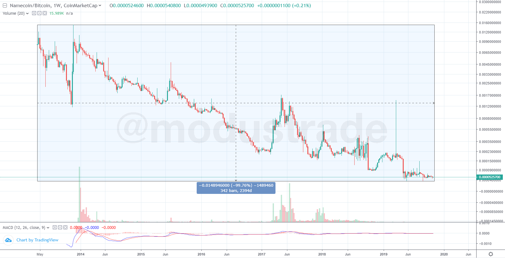 Я вам даже больше скажу... те, кто покупал там, в начале графика, уже никогда не выйдут даже в ноль. На ультра-бычьем рынке 2017 года, когда взлетало всё, этот NMC не добрался до своих хаёв ни в долларе, ни в битке. И таких примеров ооочень много.