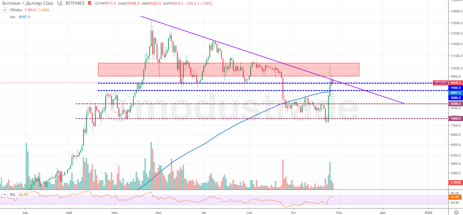 Итак, под $7500 мы благополучно зашли, как я и предполагал. Далее, мы увидели сильное движение 25.10. до $8800 на хорошей бычьей свече, а на следующий день - "fomo-выстрел" до $10600. Дневка 26.10. закрылась не в пользу покупателей с очень длинной верхней тенью, хоть и над 200-й машкой. Сейчас мы худо-бедно, стараемся пробить диагональное сопротивление. Я смотрю его на log-графике, так "честнее".