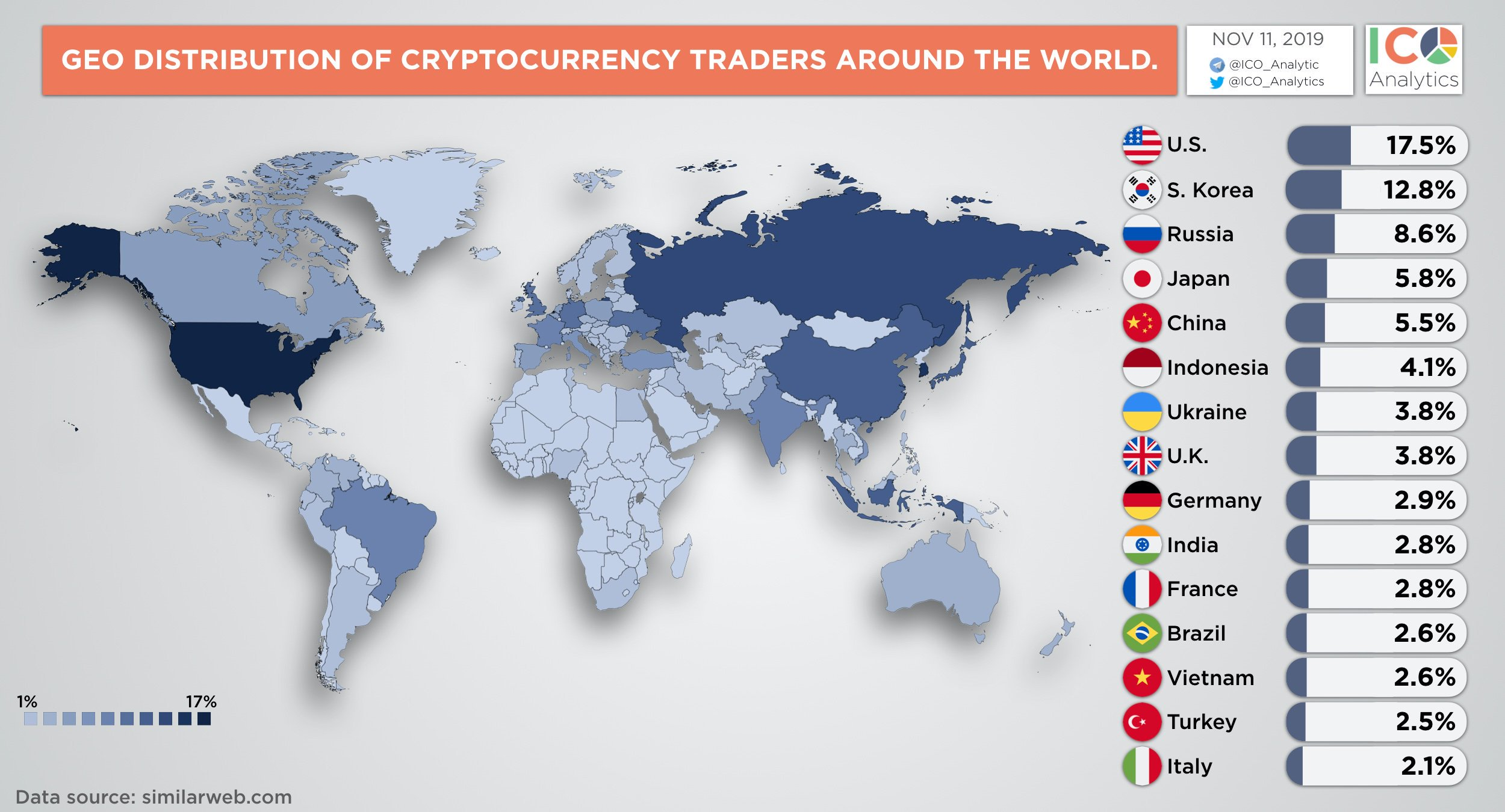Географическое расположение трейдеров, полученное на основании веб-трафика ТОП-50 криптовалютных бирж.