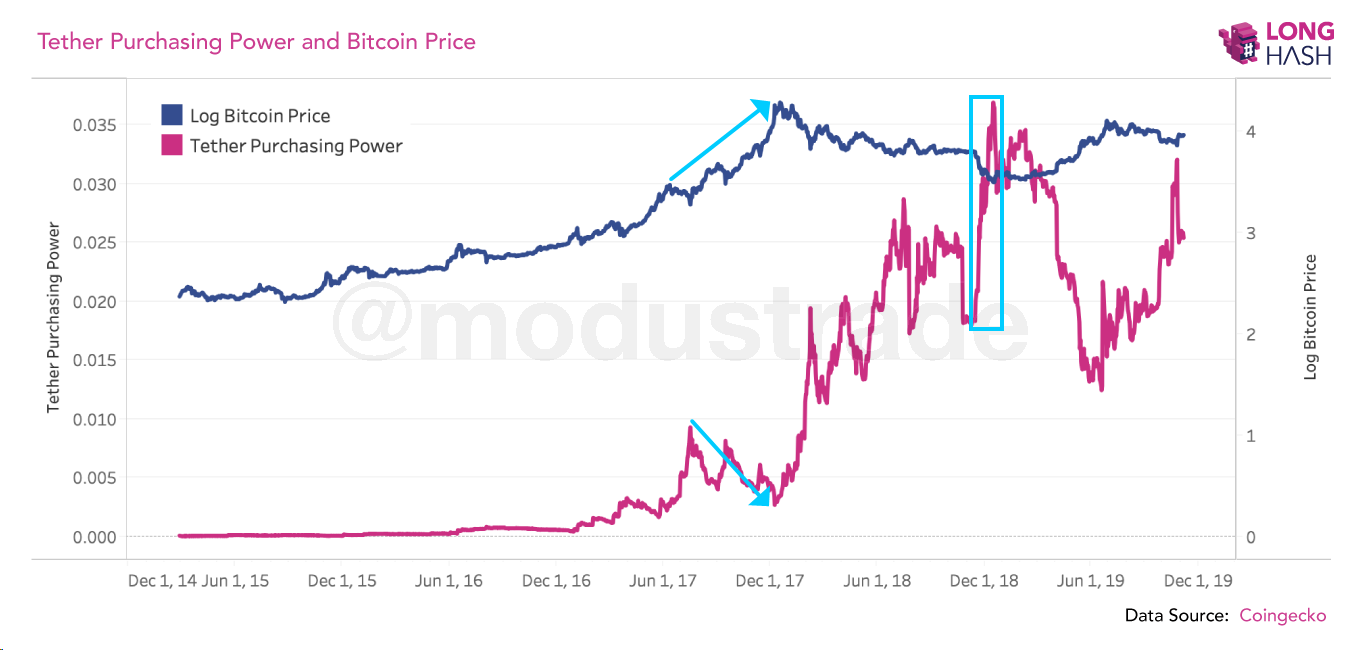 В общем, на графике видно, что в период бычьего рынка 2017 года покупательная способность Тезера увеличивалась вплоть до середины июля, а потом постепенно снижалась до конца года! Затем предложение USDT значительно выросло во время медвежьего рынка, достигнув своего пика в конце 2018 года (когда нужно было откупить мощнейший слив с $6500 до $3200).