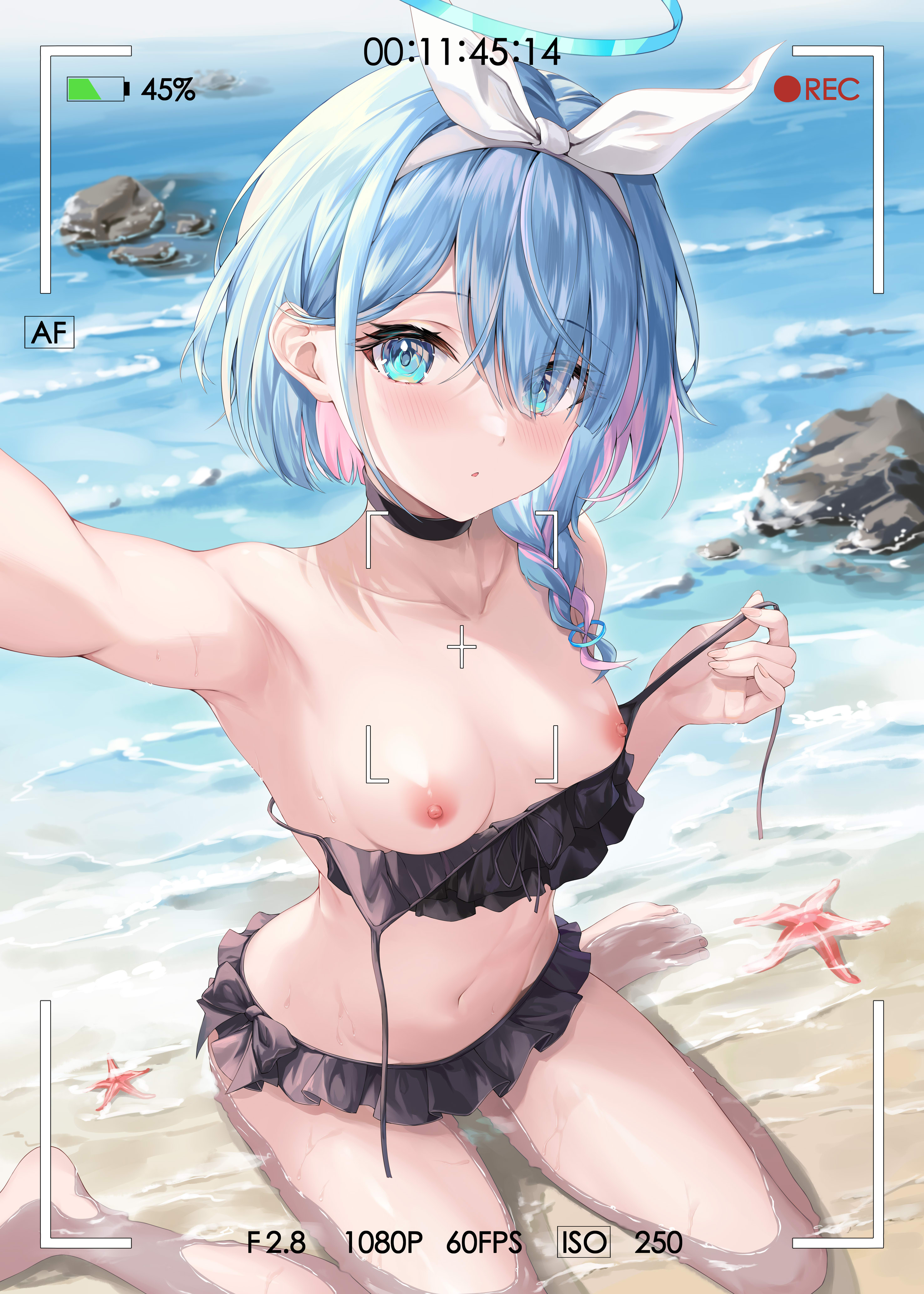 arona_(blue_archive) bikini blue_archive breasts halo nipples selfie swimsuits undressing wet zi_yue_liuli