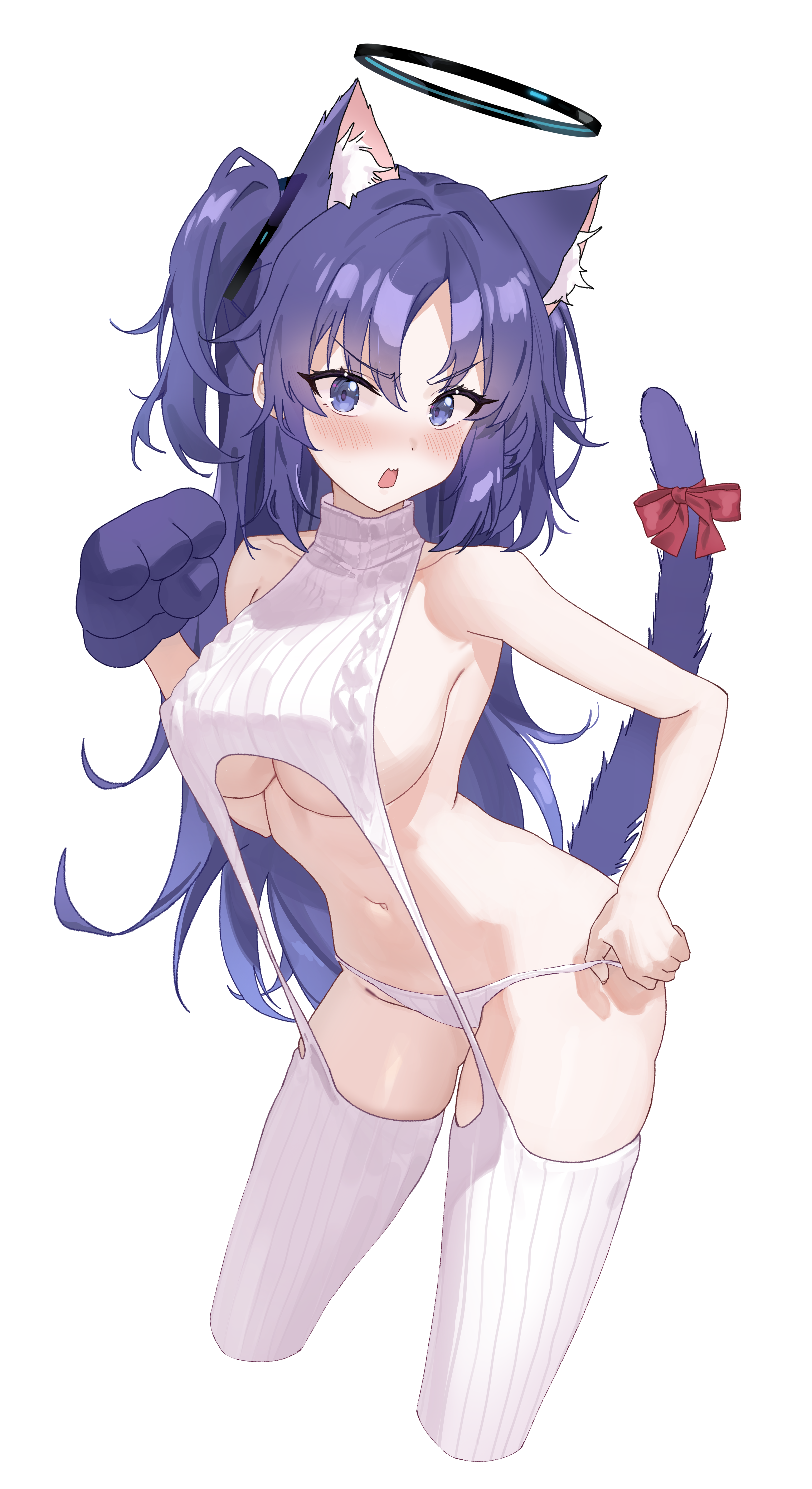 animal_ears blue_archive halo hayase_yuuka hido88 nekomimi no_bra pantsu stockings sweater tail thighhighs undressing
