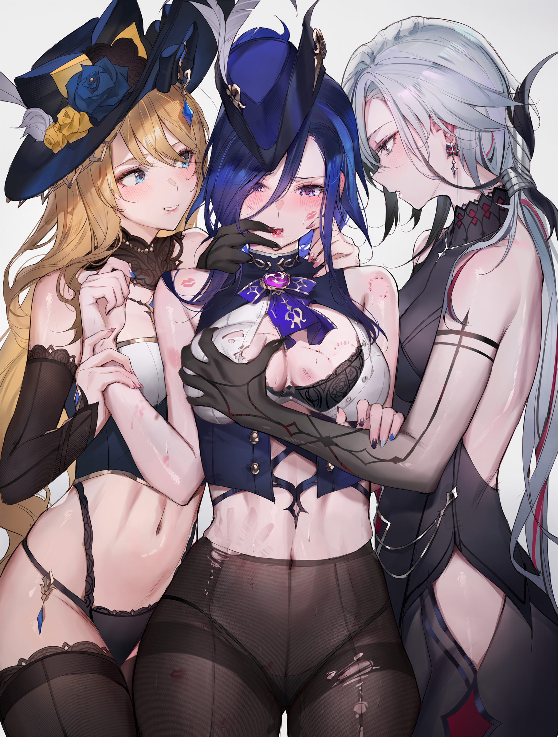 arlecchino bra breast_grab clorinde genshin_impact navia pantsu pantyhose qiandaiyiyu see_through torn_clothes yuri