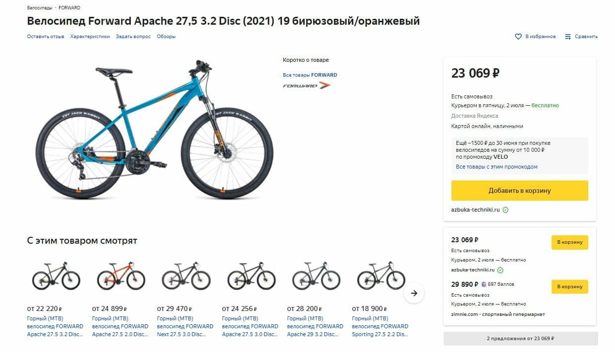 4. Яндекс.Маркет - велосипед Forward Apache 27,5 (2021) за 21569₽: