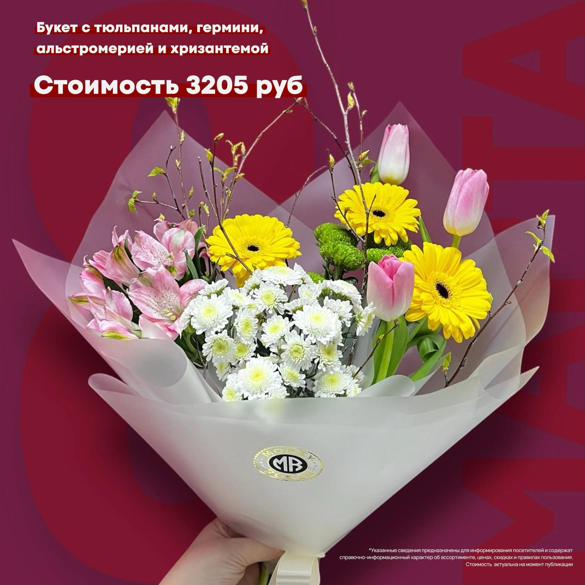 БУКЕТ №33 ИЗ ТЮЛЬПАНОВ, ГЕРМИНИ, АЛЬСТРОМЕРИИ И ХРИЗАНТЕМЫ НА 8 МАРТА