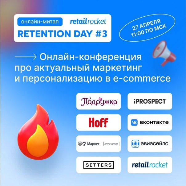 - Retail Rocket организует онлайн-конференцию Retention Day#3 🚀 Лидеры рынка расскажут, как сейчас привлекать новую аудиторию и работать с главным активом компании в любой кризис – текущей клиентской базой.