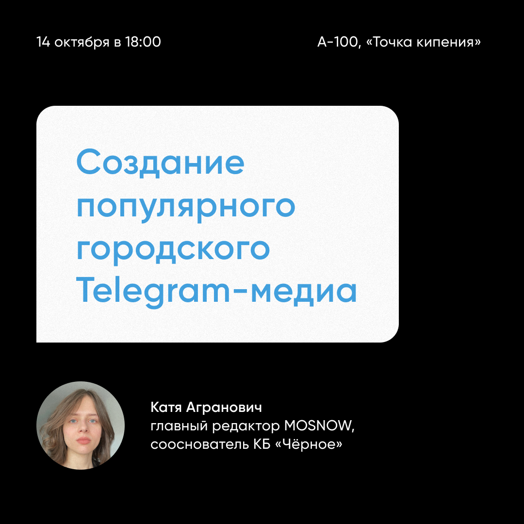 Главный редактор MOSNOW @mosnow и сооснователь КБ «Черное» Катя Агранович поделится секретом успеха создания популярного городского Telegram-канала. Расскажет, как и почему «Петербург сейчас» вошел в топ-5 медиа северной столицы за 2 месяца.