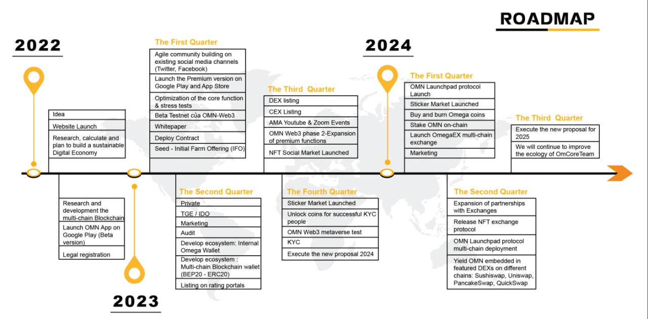 В дорожной карте говорится, что IDO и TGE токена $OMN пройдёт в мае текущего года по цене 0.32$ за токен, листинги на DEX и CEX-биржи в третьем квартале, который начинается с июня
