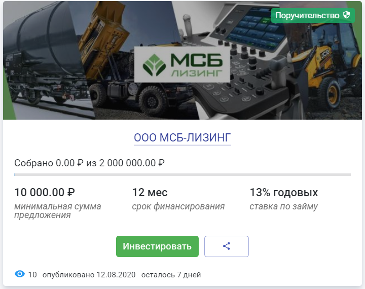 В октябре 2019 года ООО «МСБ-Лизинг» уже привлекал финансирование на платформе Money Friends в размере 1 500 000 руб. Заёмные средства были возвращены досрочно.