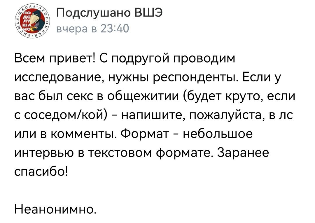Актуальные исследования в общежитиях НИУ ВШЭ. Ссылку оставляем для желающих помочь науке.