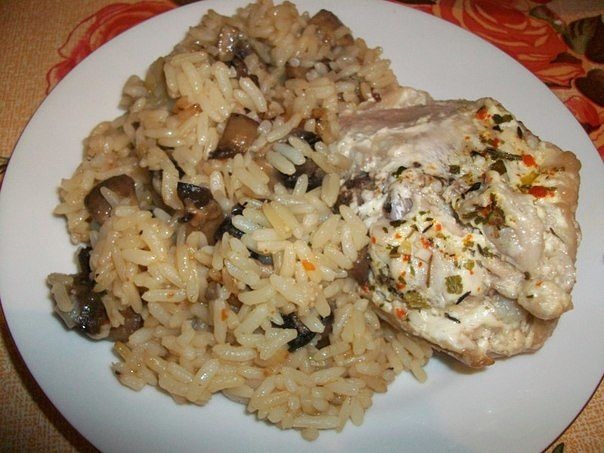После того, как МВ пропищала, открываем, засыпаем хорошо промытый рис, наливаем воду и добавляем соль-специи; перемешиваем. Извлекаем изрядно промаринованную за полчаса Мадам Коко из холодильника. В принципе, можно и подольше мариновать, если любите посолонее. Выкладываем в контейнер, добавляем сверху лавровый лист и немного травок (по желанию). Я НЕ СОЛИЛ, ибо соевый соус делает с мясом свое соленое дело. Закрываем и включаем программу "Варка на пару" на 30 минут. Все.