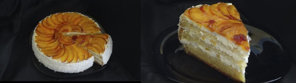Готовый бисквит нужно разрезать на два или три коржа. Каждый корж промазать кремом (я в середину крема добавил персики порезанные из компота). Сверху торт тоже намазать кремом. На крем выложил нектарины. Приготовил заливку для торта (как написано на пакетике). Сделал из фольги бортики, обернул торт, потом залил желе, когда застыло желе, убрал фольгу и промазал бока. И убрал в холодильник на ночь. Получилось очень вкусно!