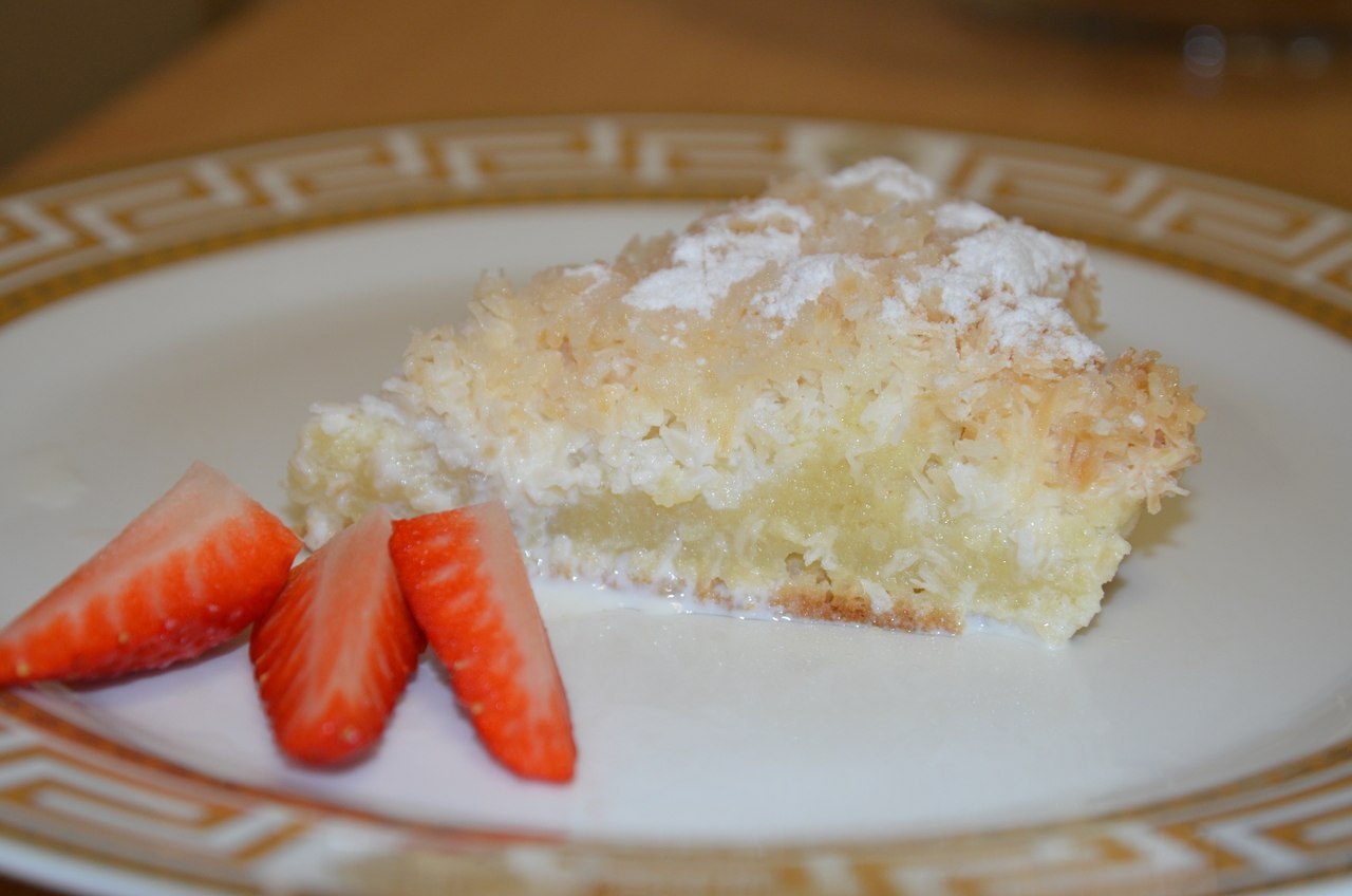 Для начинки смешать в сухой посуде 0,5 стакана сахара с 100 г кокосовой стружки и 1 пакетиком ванильного сахара. Эту смесь равномерно распределить по всей поверхности теста. Поставить в нагретую МВ на режим " выпечка " 40 минут. Готовый горячий пирог равномерно полить сливками. Сверху посыпать сахарной пудрой.