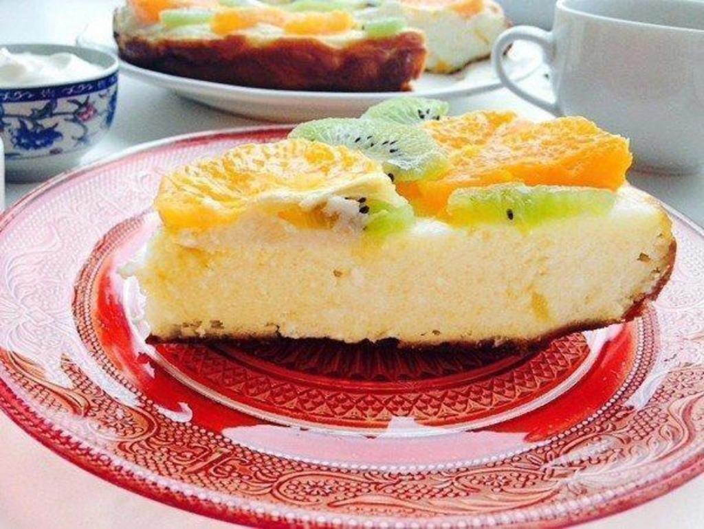 5. Теперь дело за украшением: я нарезала фрукты и выложила их фигурно на запеканку. А затем залила небольшим (мне не хотелось толстого слоя желе) количеством грушевого сока с растворенным желатином (готовить такой сироп для будущего желе лучше по рецепту с упаковки желатина).