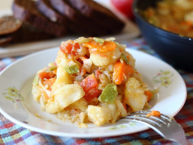 В воде растворите специи, добавьте соль и залейте ее к овощам. Тщательно перемешайте, закройте крышку и нажмите «Старт». Через 10 минут добавьте мякоть помидора без семян и кожицы. Очищенный чеснок нарежьте слайсами или мелко измельчите ножом. Через 15 минут после начала тушения загрузите его в чашу. Готовому блюду дайте постоять 10-15 минут и подавайте к столу.