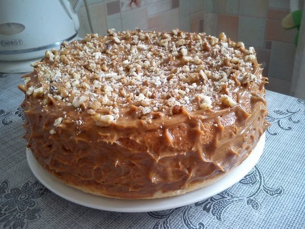 Когда бисквит готов при помощи решетки-пароварки переворачиваем наш тортик вверх тормашками...предварительно немного отсоединить бока лопаткой. Бумага очень легко отрывается. Даем остыть. Промазываем кремом. Кто какой любит. У меня был варенной сгущенки плюс сливочное масло. Торт разделила на три части. Каждый слой сбрызнула коньяком, потом крем и грецкие орешки. Даем настояться. Получилось превосходно!