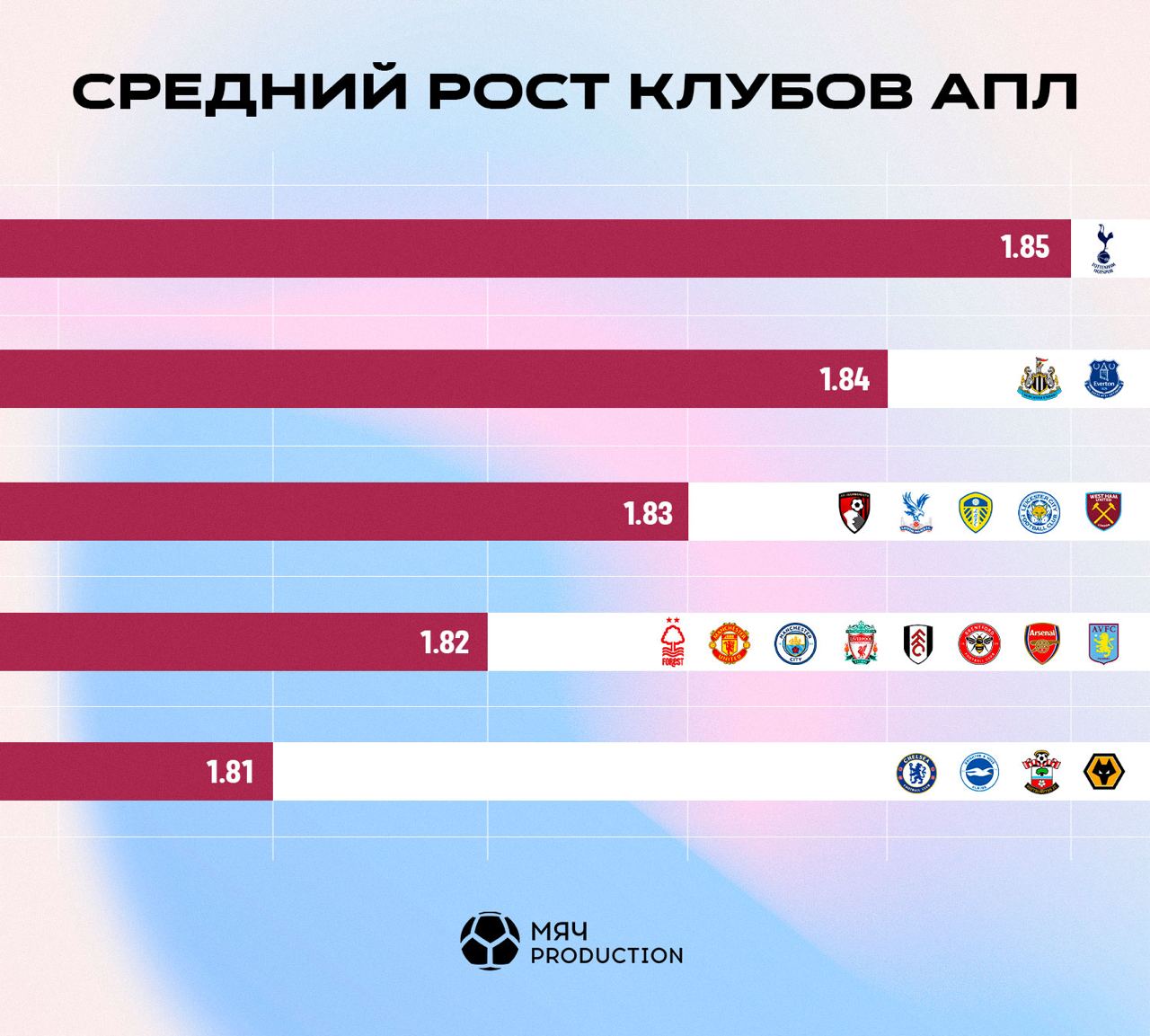 В The Athletic вывели усредненные показатели роста среди игроков АПЛ-2022/23 и натолкнули на вопрос о том, имеют ли эти цифры принципиальное значение. «Тоттенхэм» оказался наиболее высокорослым, а «Челси» – самым миниатюрным из представителей топ-4.