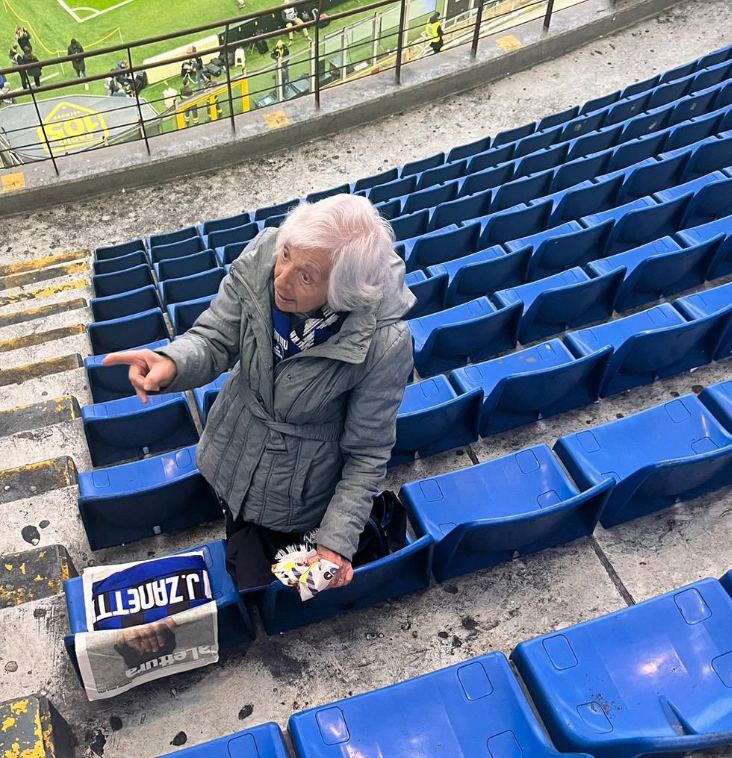 Джанкарла Гариати на месте! Она пришла на трибуны почти за 3 часа до начала дерби Италии. Напоминаю: это одна из самых популярных болельщиц, которой сейчас 87 лет. Я писал о синьоре Джанкарле в этом материале.