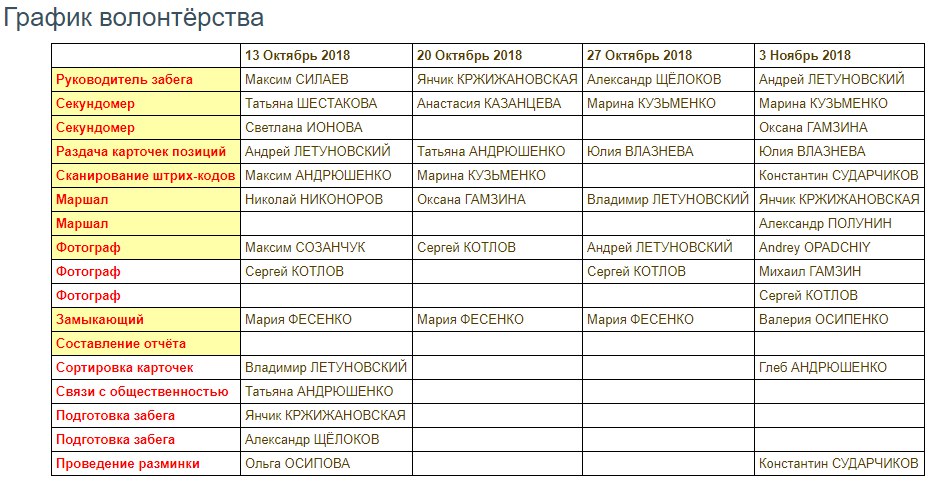 Картинка, которая будет интересна организаторам parkrun. График волонтёров @parkrunkuzminki на месяц вперёд.