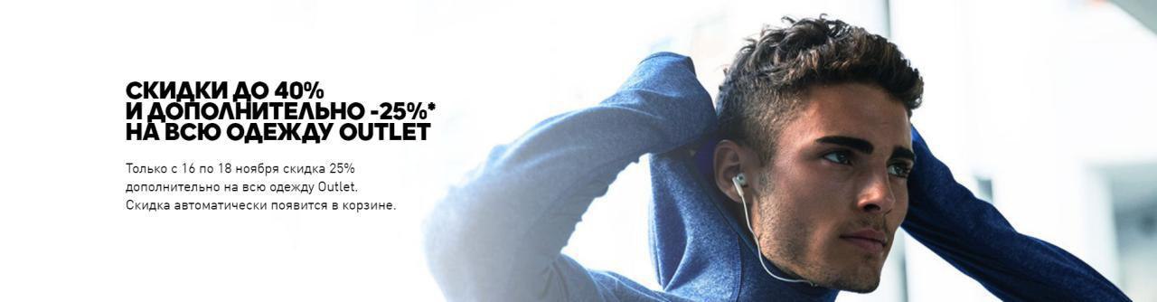 В Reebok действуют такие же условия, только скидка тут ещё больше - 30%. Можно хорошо закупиться как вещами из новой коллекции, так и из раздела Outlet, где все товары идут уже со скидками до 55%.