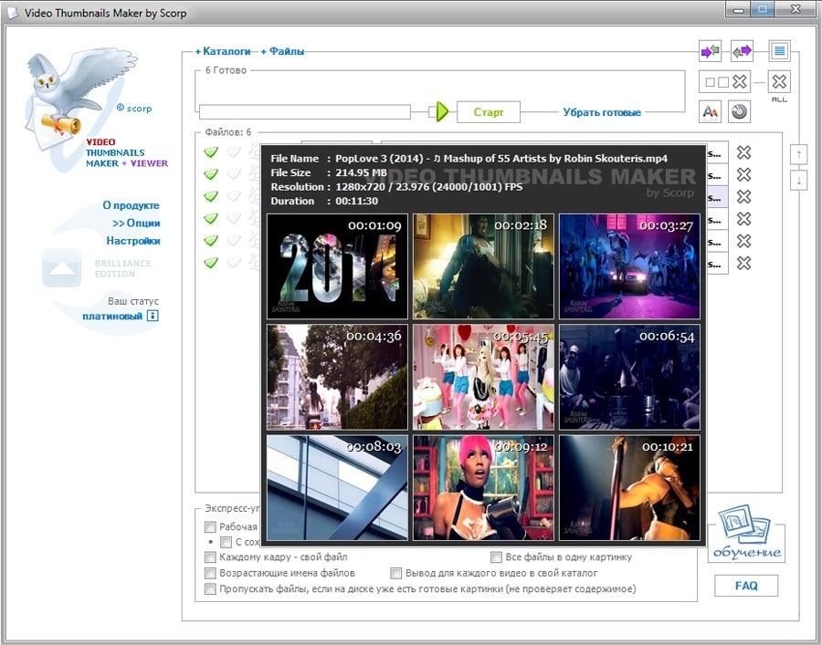 Video Thumbnails Maker - программа позволит вам создавать файлы предварительного просмотра видео. После того как вы добавите видеофайлы, она их обработает, извлечет кадры с заданной вами периодичностью, а после уже результат будет сохранен как графический файл. Утилита легко может работать в пакетном режиме, за один раз вы сможете обработать нужное вам количество видео. Есть возможность добавить водяной знак