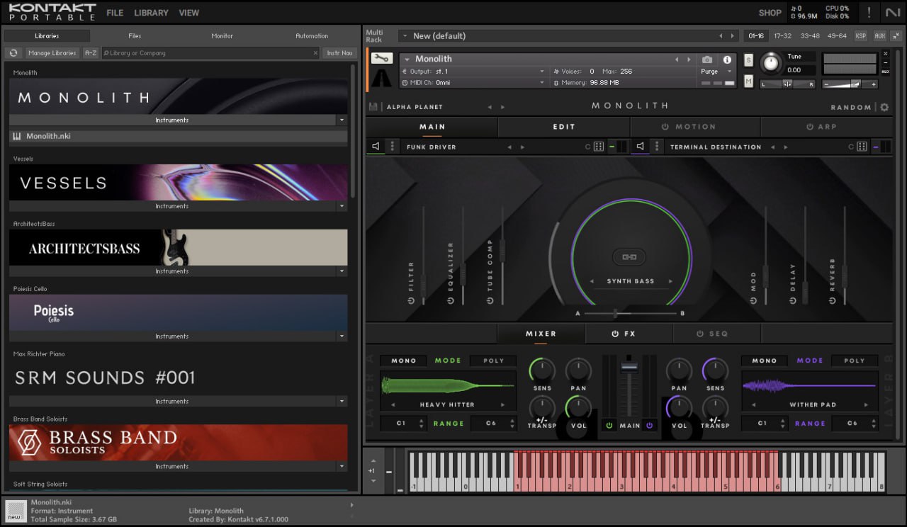 Monolith — это механизм бесконечного баса, готовый вознести вашу музыку к невероятным высотам. Используйте сотни потрясающих пресетов, чтобы быстро прореза́ть свой микс, или углубитесь в настройки, чтобы создать собственные басовые тембры. Используйте любую из 85 групп высококачественных басов, сабвуферов, оркестровых и синтезаторных сэмплов или импортируйте собственные сэмплы для бесконечного вдохновения.