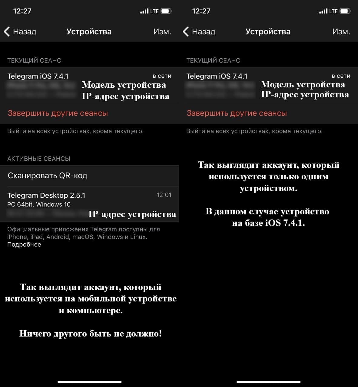 4. При использовании мессенджера Телеграм, необходимо ежедневно контролировать устройства, использующие ваш аккаунт. Проверить можно следующим образом: Открыть мессенджер Телеграм, войти в настройки, далее нажать кнопку «Устройства». В указанном меню будут указаны активные сеансы, где будет видно версию приложения, устройство, на котором осуществлён вход в аккаунт и IP-адрес. В случае обнаружения неизвестных устройств, необходимо нажать кнопку «Завершить другие сеансы», после чего устройство необходимо обновить до заводских настроек.