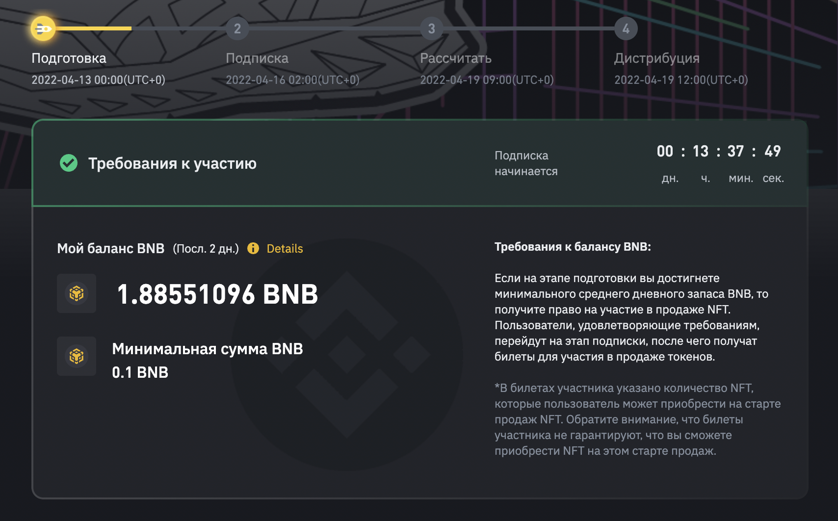— Держать на балансе не меньше 0.1 BNB с 13 апреля по 16 апреля. Дроп проходит по системе подписки.