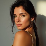 1. Классический портрет в студии 📷 "professional portrait photo of a stylish female designer, wearing a black blazer and minimal gold jewelry, soft studio lighting, neutral beige backdrop, confident direct eye contact, subtle smile, DSLR-style bokeh, 50mm lens"