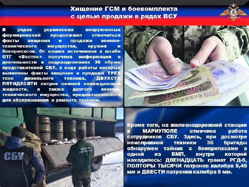 В рядах украинских вооруженных формирований продолжают отмечаться факты хищения и продажи военно-технического имущества, оружия и боеприпасов. От наших источников в штабе ОТГ «Восток» получена информация о деятельности в подразделениях 36 обрмп представителей СБУ, в ходе работы которых выявлены факты хищения и продажи ТРЁХ тонн дизельного топлива, ДВУХСТА ПЯТИДЕСЯТИ литров зимней охлаждающей жидкости, а также другого военно-технического имущества, предназначенного для обслуживания и ремонта техники.